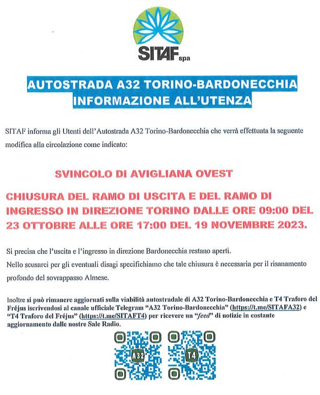 La Sitaf ha comunicato la chiusura presidiata del ramo di ingresso dello svincolo di Avigliana Ovest, in direzione Torino, dalle ore 09.00 del 23 Ottobre sino alle ore 17.00 del 19 Novembre 2023, con dirottamento del traffico sulla S.P 24.