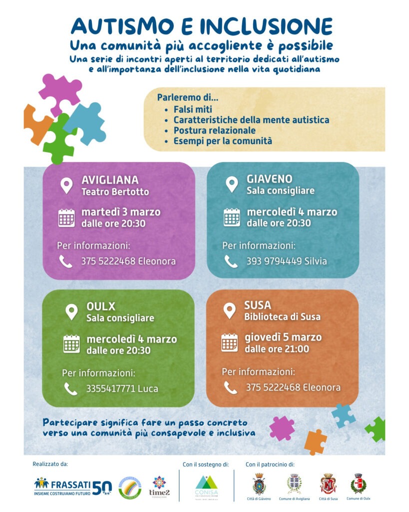 Sono 4 le serate sul tema in Valle di Susa, il progetto è gestito dalla Cooperativa Frassati in collaborazione con Cooperativa sociale Arcobaleno, con il sostegno di Fondazione Time2 e consorzio socioassistenziale Conisa e il patrocinio dei Comuni di Giaveno, Oulx, Susa nei quali si svolgono gli altri tre incontri come da indicazioni in locandina. L’ingresso è libero e gratuito.