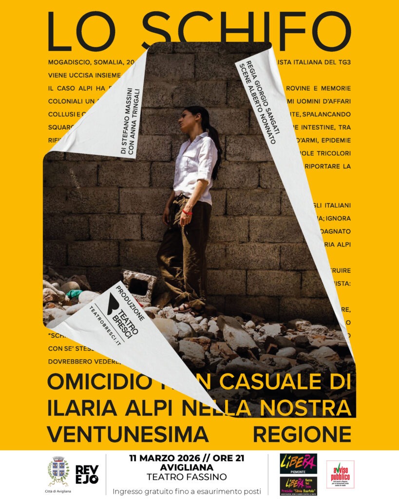 Avigliana, 2 marzo 2026 – Va in scena mercoledì 11 marzo 2026 alle 21 al Teatro Fassino di Avigliana lo spettacolo teatrale sulla storia di Ilaria Alpi, la giornalista italiana del Tg3, uccisa insieme al suo operatore Miran Hrovatin a Mogadiscio, Somalia, il 20 marzo 1994. Lo spettacolo, con il patrocinio del Comune di Avigliana, in collaborazione con Libera e Avviso pubblico, è una delle iniziative della .