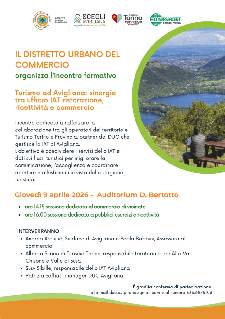 Avigliana, 2 aprile 2026 – Il Distretto urbano del Commercio (Duc) di Avigliana organizza un incontro formativo dedicato a creare nuove sinergie tra l’Ufficio Informazioni accoglienza turistica (Iat), il settore della ristorazione, della ricettività e il commercio locale, con l’obiettivo di migliorare l’accoglienza e la comunicazione in vista della stagione turistica.