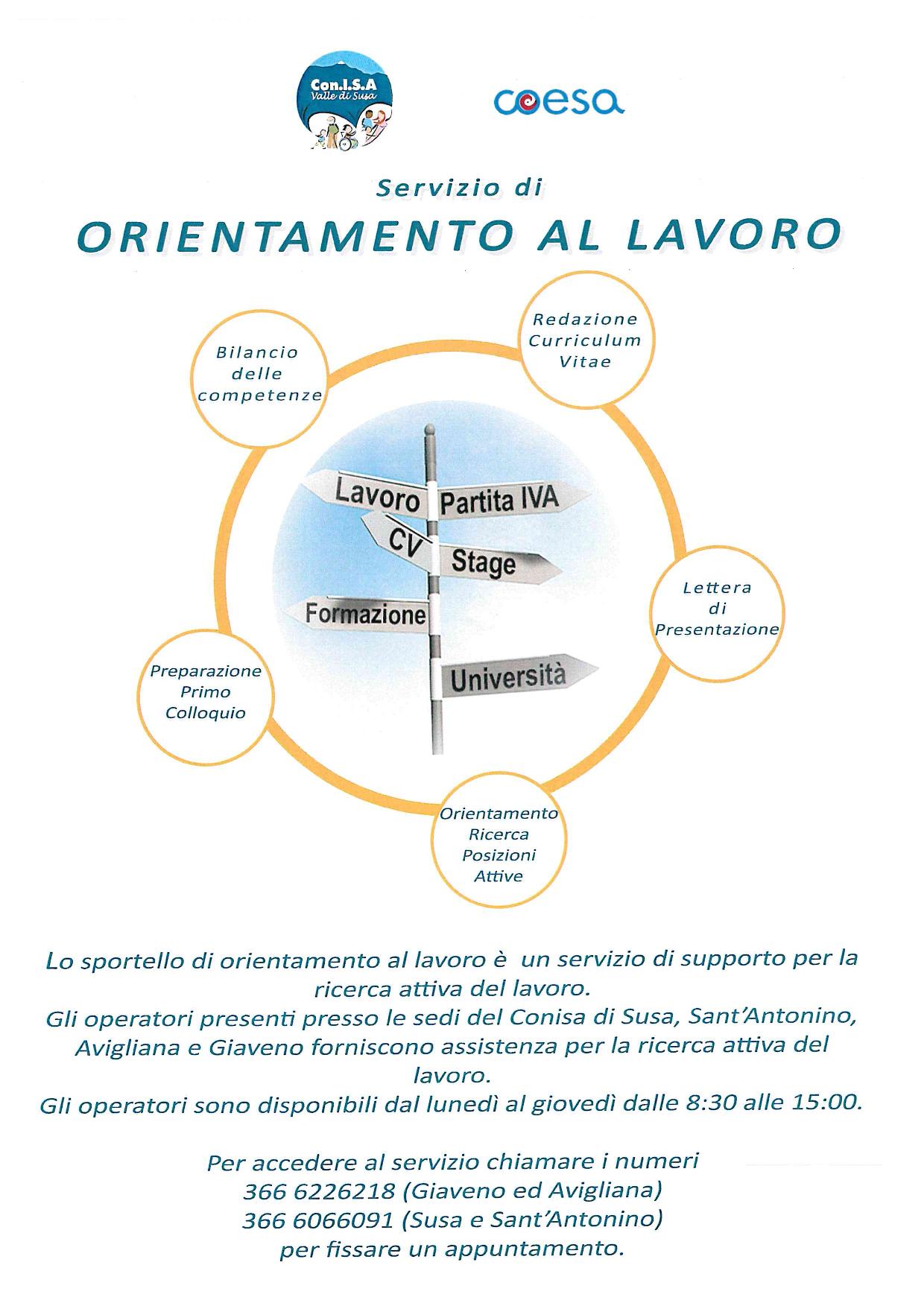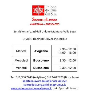 Sportello Lavoro - Unione Montana Valle Susa PRIMO PIANO del Centro Commerciale "Le Torri" di Avigliana (corso Laghi 84). Tel. 011 9327740 email: sportellolavoro.avigliana@umvs.it sito web: www.unionemontanavallesusa.it Orari: Martedì 10 - 12 / 14 - 16