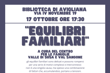 Il Comune di Avigliana informa la cittadinanza che venerdì 17 ottobre, presso la Biblioteca civica, si terrà l’incontro pubblico gratuito dal titolo “Equilibri familiari”, a cura del Centro per le...