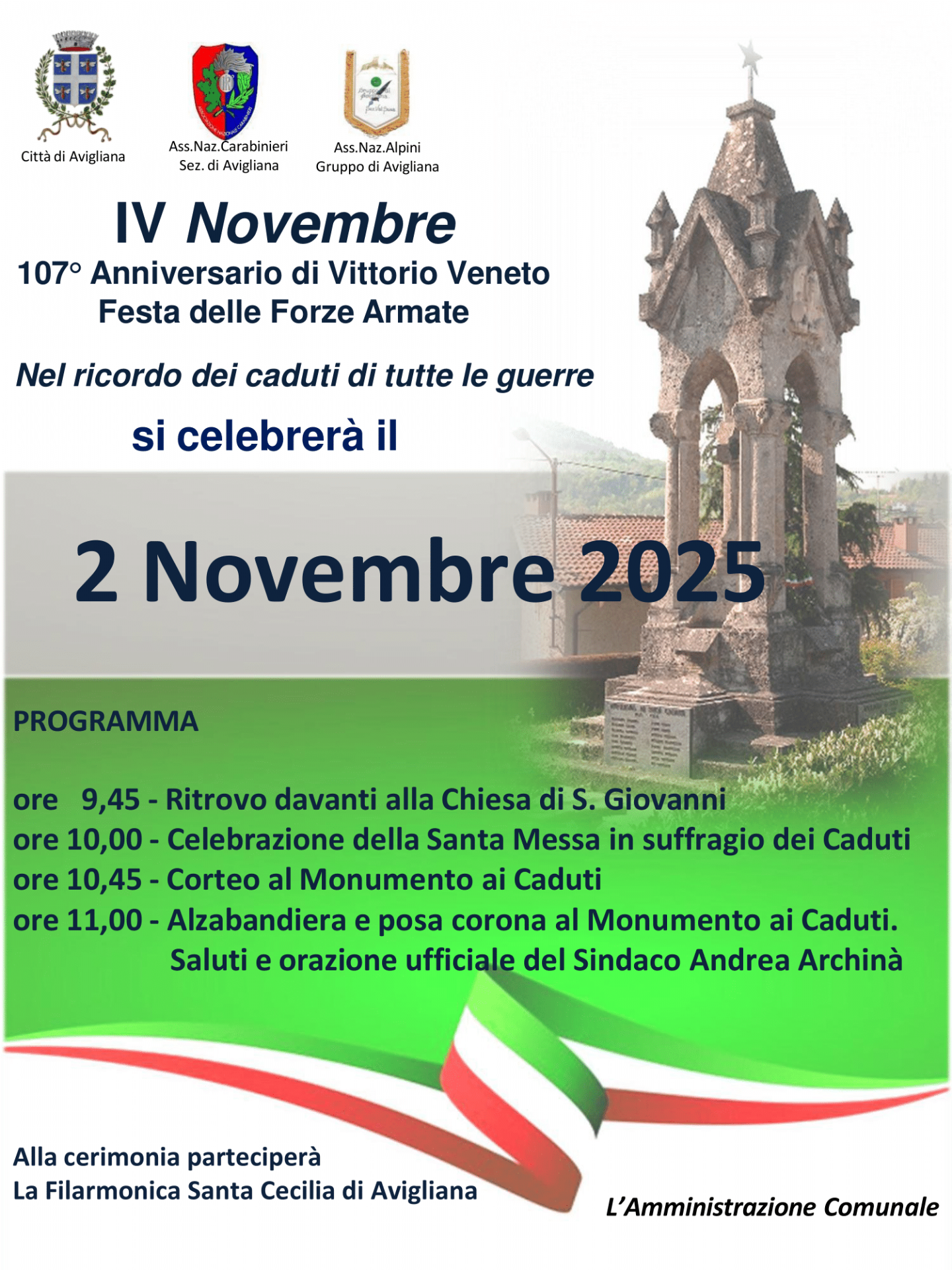 L’Amministrazione Comunale di Avigliana, in collaborazione con l’Associazione Nazionale Carabinieri – Sezione di Avigliana e l’Associazione Nazionale Alpini – Gruppo di Avigliana, invita la cittadinanza alla cerimonia commemorativa del IV Novembre, in ricordo dei caduti di tutte le guerre e in occasione del 107° Anniversario della Battaglia di Vittorio Veneto.