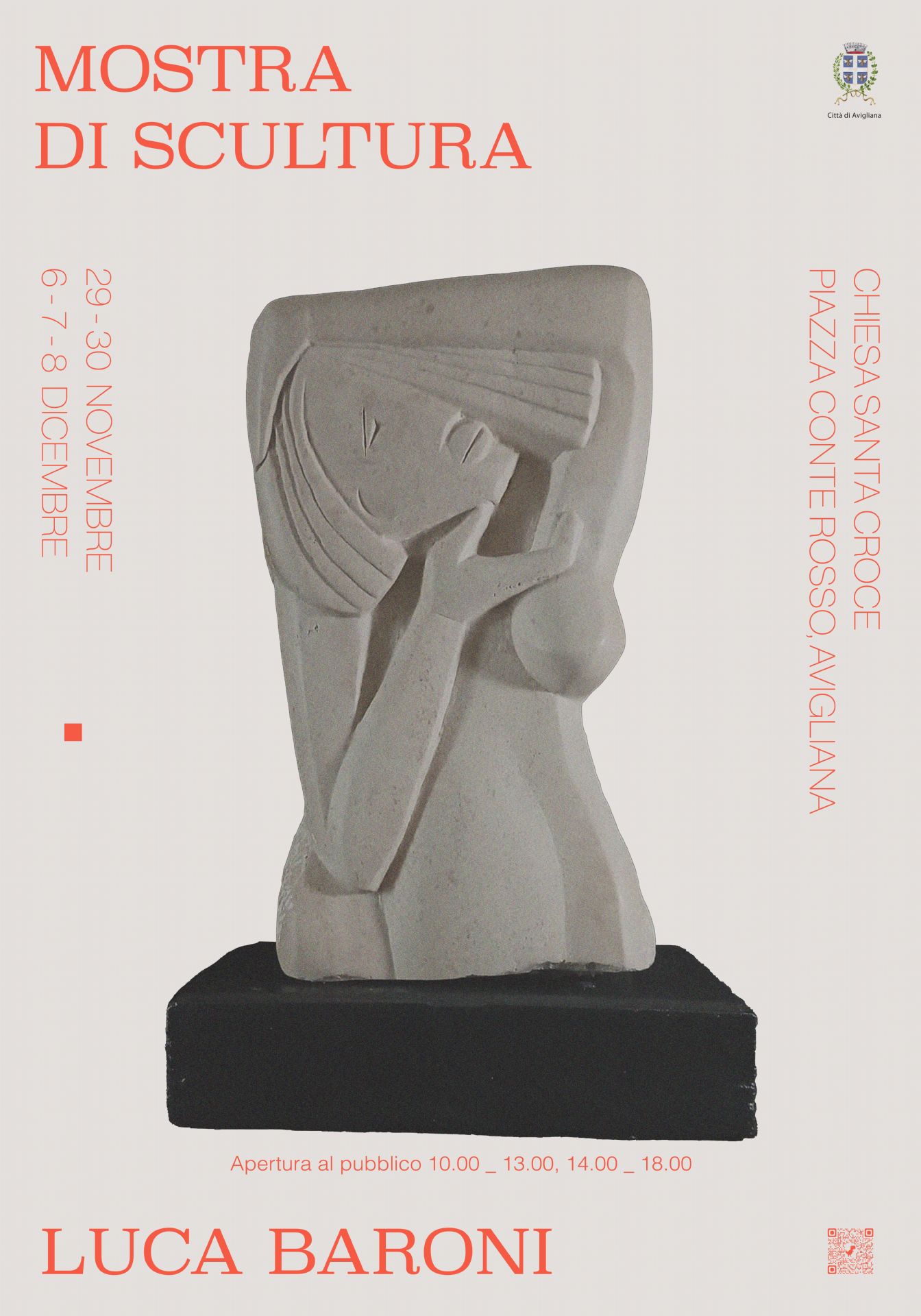 La Città di Avigliana ospita, nella chiesa di Santa Croce in piazza Conte Rosso, la Mostra di Scultura dell’artista Luca Baroni, aperta al pubblico dal 29 al 30 novembre e dal 6 all’8 dicembre. L’esposizione presenta una selezione di opere recenti che testimoniano la ricerca plastica dell’autore, con particolare attenzione alle forme essenziali e all’espressività della materia.