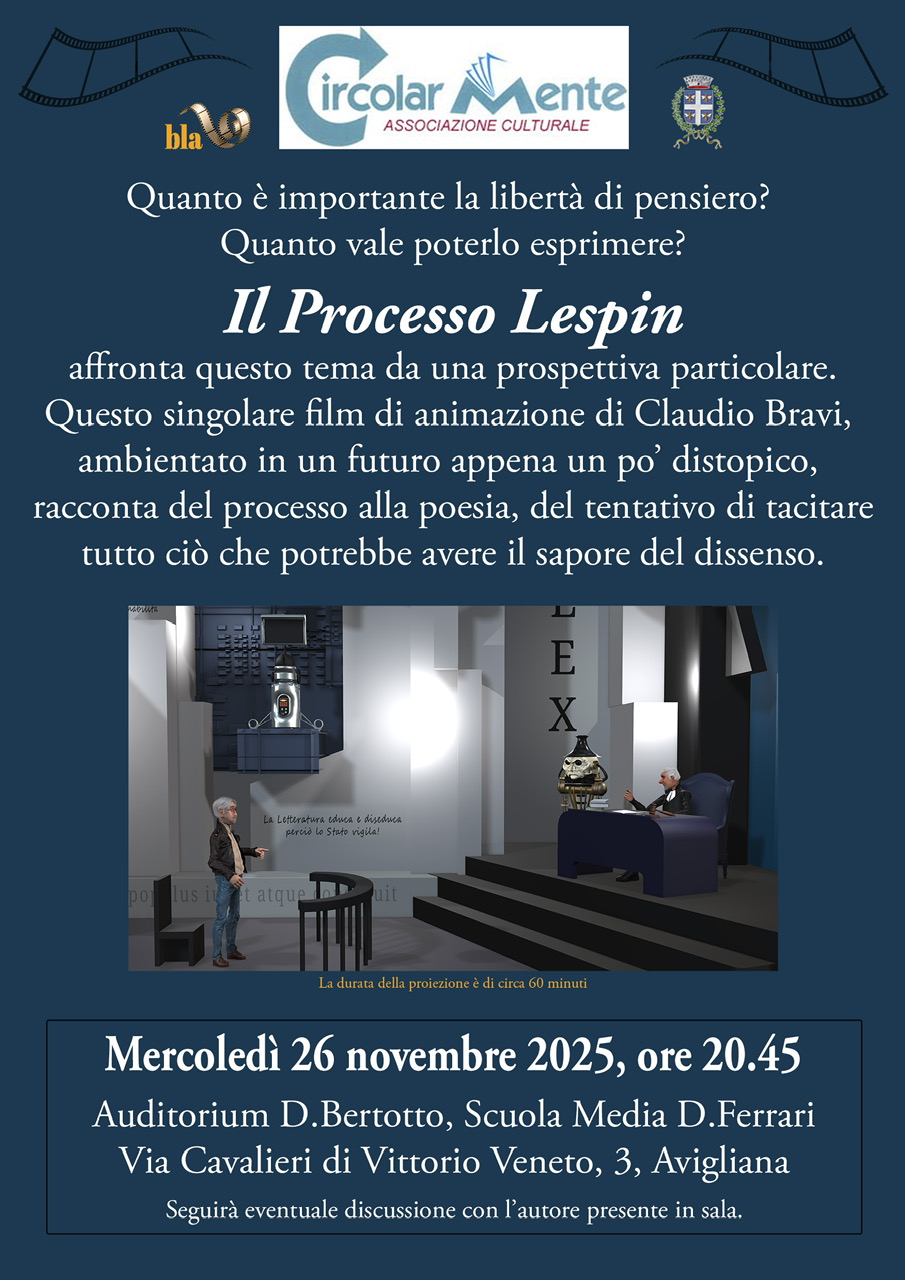 L’associazione culturale Circolarte propone la proiezione del film di animazione Il Processo Lespin, realizzato da Claudio Bravi. L’opera affronta il tema della libertà di pensiero e del suo valore all’interno della società, offrendo una prospettiva originale e critica. Ambientato in un futuro leggermente distopico, il film racconta un processo simbolico alla poesia e, più in generale, a ogni forma di espressione che possa contenere un elemento di dissenso.