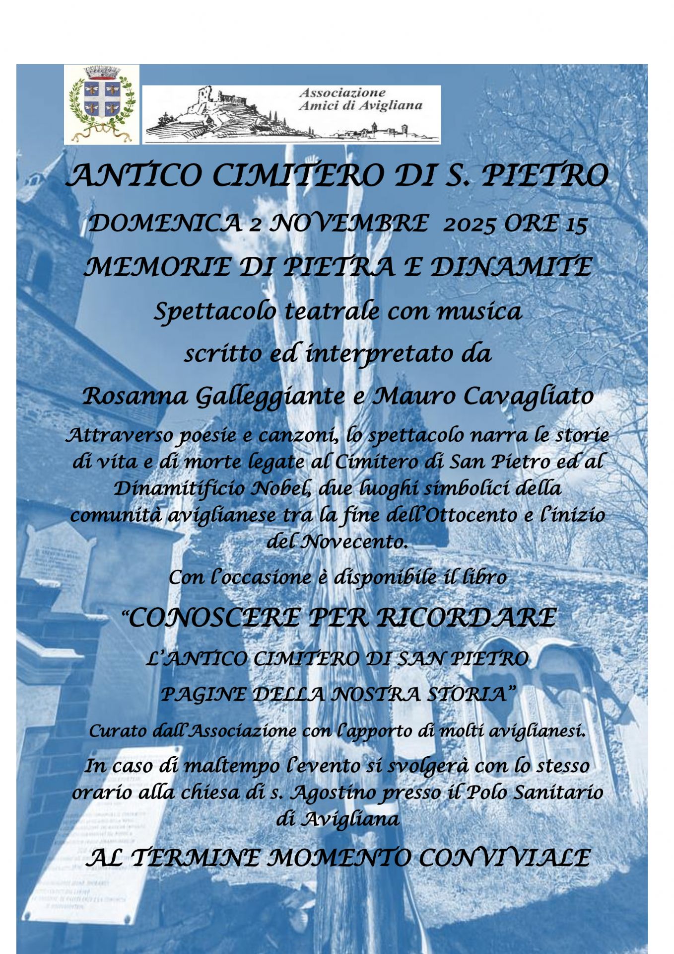 L’Associazione “Amici di Avigliana”, con il patrocinio del Comune, organizza per domenica 2 novembre 2025 alle ore 15:00 presso l’Antico Cimitero di San Pietro lo spettacolo teatrale con musica dal titolo “Memorie di pietra e dinamite”, scritto e interpretato da Rosanna Galleggiante e Mauro Cavagliato.