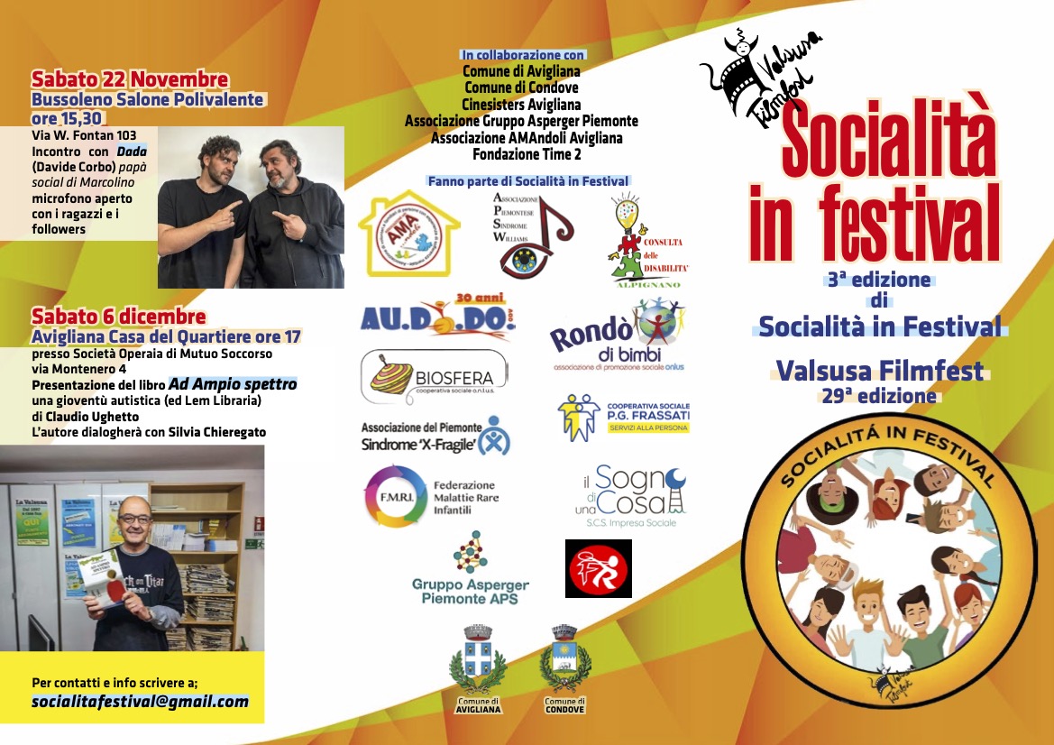 Socialità in festival è un’iniziativa fortemente voluta da alcuni ragazzi e ragazze con disabilità che, frequentando eventi culturali come lo storico Valsusa film festival, i quali hanno maturato la volontà di avere uno spazio per proporre uno sguardo diverso sulla disabilità e poter raccontare chi sono e come vivono, soprattutto la socialità.